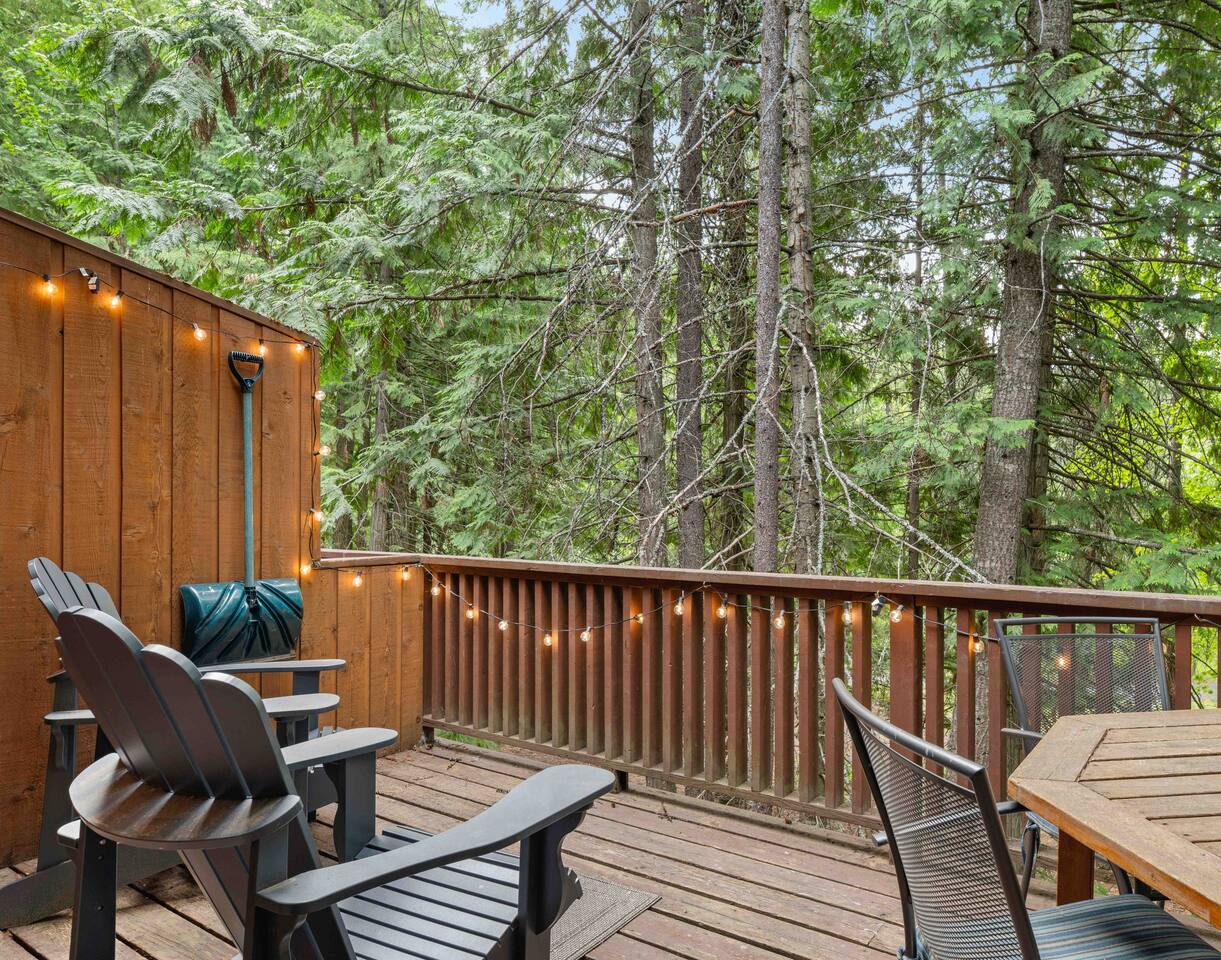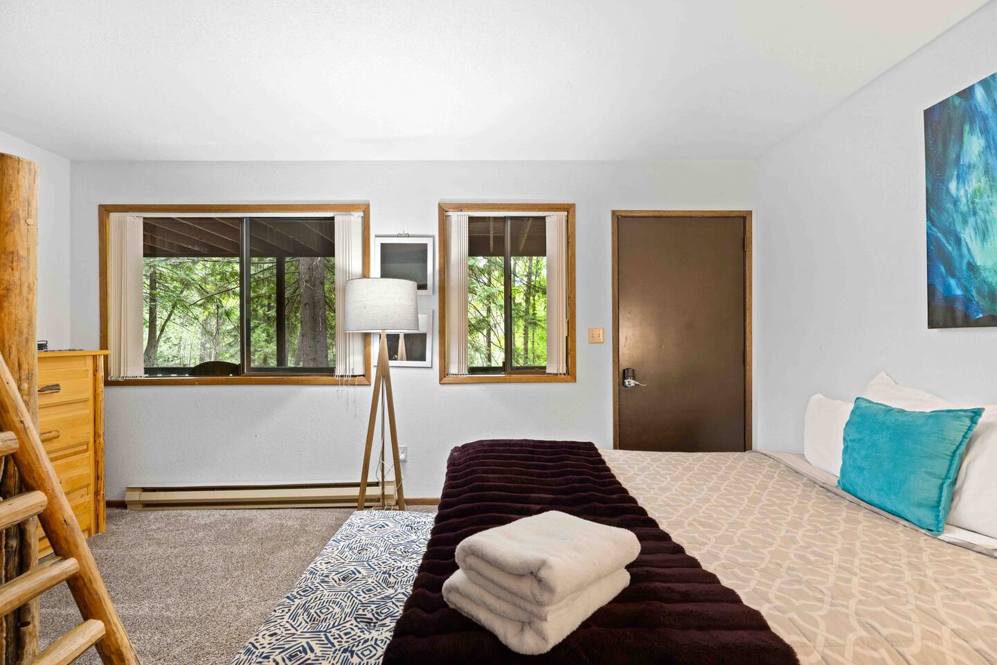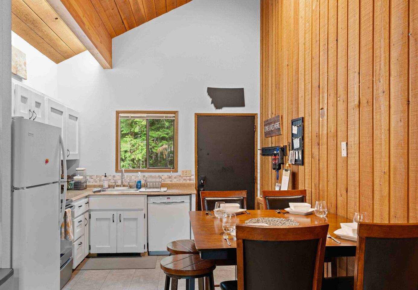 Welcome to your chalet chic cabin-condo in the heart of Montana’s adventure playground. Tucked into the trees in charming Ptarmigan Village, this mountain-modern getaway in a resort community sleeps six and puts you just minutes from it all: 5 minutes to the ski slopes, 10 minutes to downtown Whitefish, and 32 scenic miles from breathtaking Glacier National Park. The Perfect Year-Round Escape In winter, unwind fireside after a day of skiing or snowboarding, or take a soothing soak in the large shared hot tub. When the snow melts, trade your skis for hiking boots or a swimsuit—there’s peace and quiet, beautiful trails, lakes, and local charm waiting for you in every season. Shop, dine, explore, or just relax and recharge. The Space Our two-story end unit is located in the Cascade Building at Ptarmigan Village—very quiet, surrounded by nature, and adjacent from Elmers Pond - small fishing pond, offering great fun for the little ones! It's just a short walk to the indoor pool and hot tub (you’ll find a map in the photos). The unit has been thoughtfully updated with a stylish, modern mountain feel you’ll love. Inside you’ll find: 🛏️ Two bedrooms with premium linens and freshly laundered duvet covers 🛁 Two full bathrooms with tub/shower combos 🍽️ Fully stocked kitchen and dining area that seats five ☕ Spacious balcony for morning coffee or evening stargazing 🔥 Cozy fireplace (available fall through spring) 📺 55” flat-screen TV with streaming, DVD player, and soundbar 📚 Books, games, and DVDs for relaxing nights in 👶 Pack ’n Play and kid-friendly touches for families Please Note: There are 33 steps leading to the front door, plus a spiral staircase inside—worth it for the views, but may not suit everyone. A/C is limited to a portable unit in the upstairs area. We provide coffee and basic consumables for the first 3 days of your stay—longer stays will need to restock. Clean towels and linens provided. Internet service is available but not guaranteed, as we rely on local providers. We’d love to host you in our cozy Whitefish retreat—whether you’re here for powder days, summer hikes, or a quiet mountain escape, you’re in for a memorable stay!